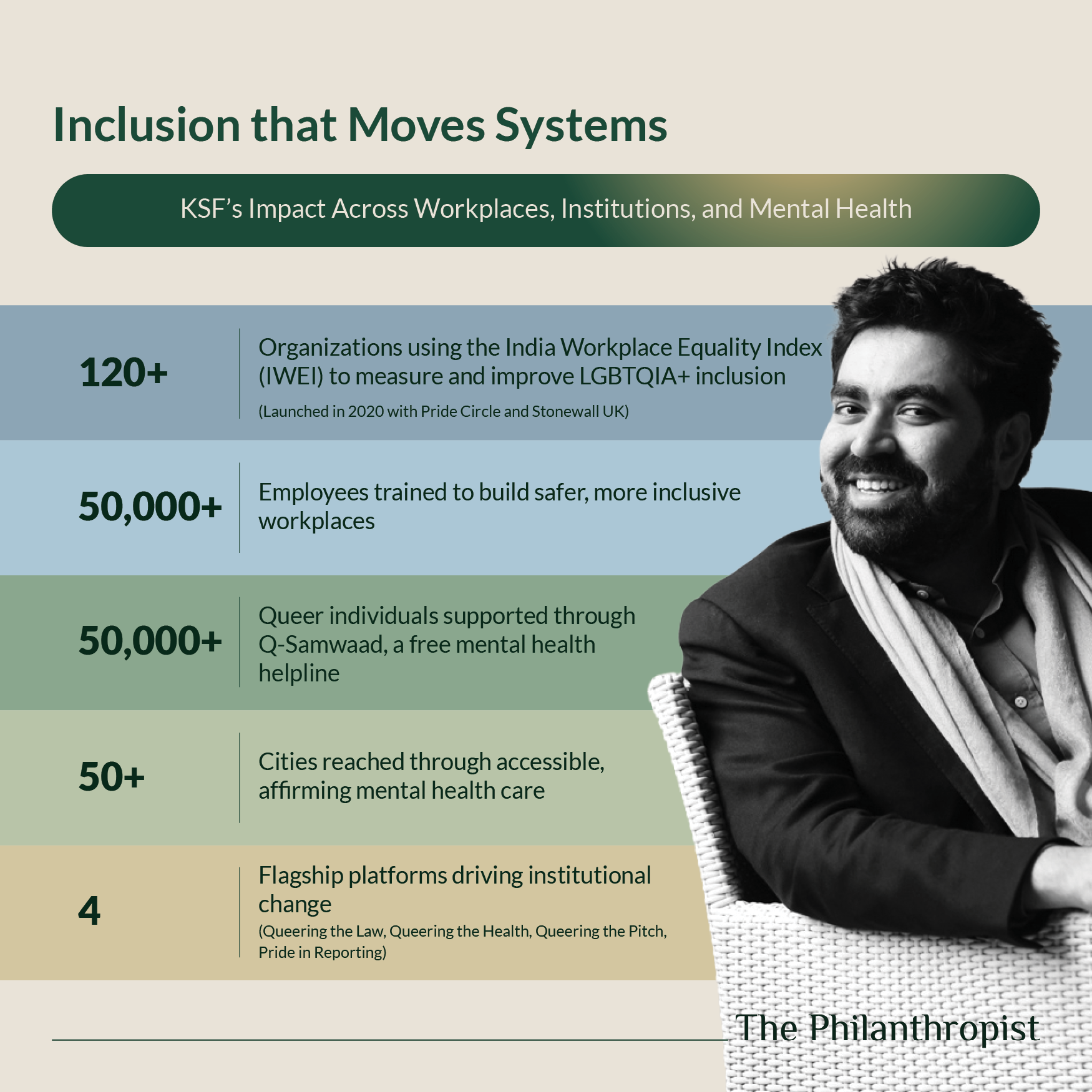 Over time, KSF has launched inclusive job fairs and scholarships, trained queer-affirmative counsellors, and built mental health helplines. Launched in 2020, the India Workplace Equality Index (IWEI) in collaboration with Pride Circle and Stonewall UK, has given 120+ organizations the tools to measure and improve LGBTQIA+ inclusion, and trained over 50,000 employees. Through its flagship series, Queering the Law, Queering the Health, Queering the Pitch, and Pride in Reporting, KSF is facilitating urgent, pivotal conversations toward structural change in how courts, hospitals, workplaces, and even media understand the queer experience.